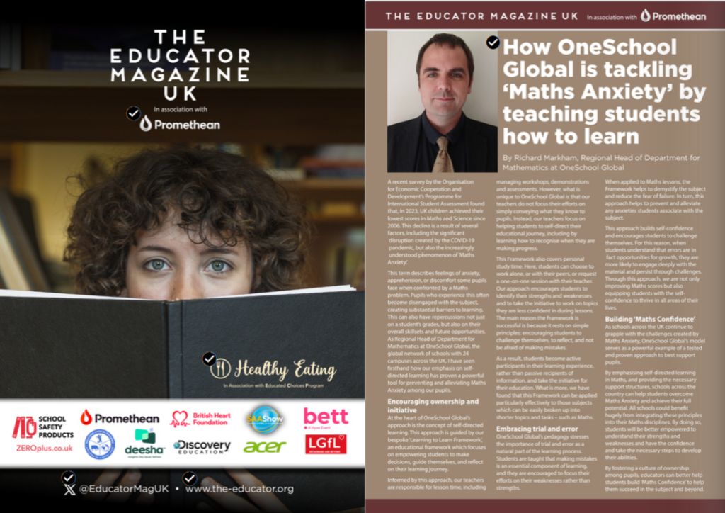 OneSchool Global was featured in a recent edition of Educator Magazine UK, which reaches around 275,000 teachers and school staff. In the article, Richard Markham, our Regional Head of Department, discusses the issue of ‘Maths Anxiety’ and how we address it through our unique teaching method of teaching students how to learn. This piece offers […]