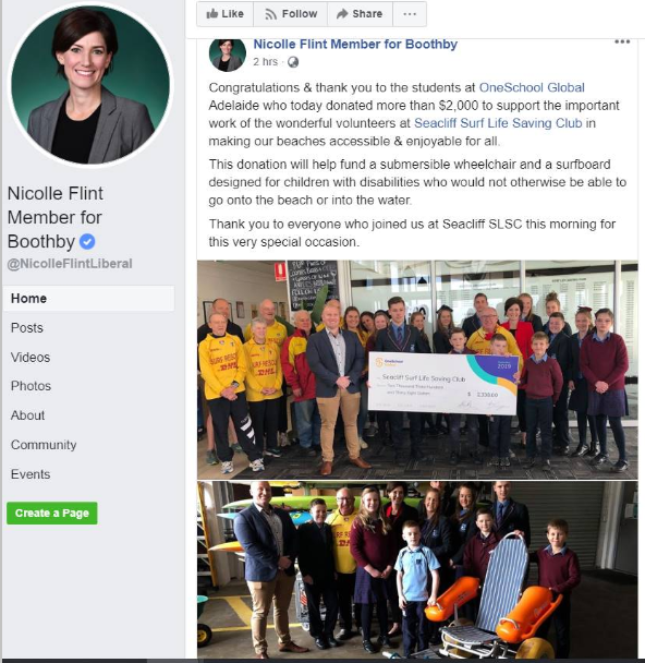 OneSchool Global’s Adelaide Campus students, supported by Federal Member Nicolle Flint MP, have today presented a cheque for $2,338 to Seacliff Surf Lifesaving Club to help fund a submersible wheelchair and a surfboard designed for children with disabilities.